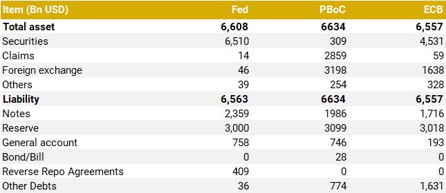 Chỉ cần nhìn vào cấu trúc BCĐKT, chúng ta có thể đọc vị được toàn bộ mô hình kinh tế và cách thức điều hành của một quốc gia. BCĐKT của Fed/ECB bị thống trị bởi Securities bên phía Tài sản; đây là dấu hiệu của một nền kinh tế thực hiện QE quy mô lớn, nơi CSTT được thực thi bằng cách mua tài sản tài chính và vận hành trong môi trường dư thừa thanh khoản. Ngược lại, BCĐKT của PBoC bị thống trị bởi Foreign Exchange (phản ánh mô hình xuất khẩu) và Claims bên phía Tài sản. Đây là dấu hiệu của một nền kinh tế mà CSTT bị ràng buộc mạnh mẽ bởi tỷ giá và sử dụng các công cụ cho vay trực tiếp để điều tiết thanh khoản.