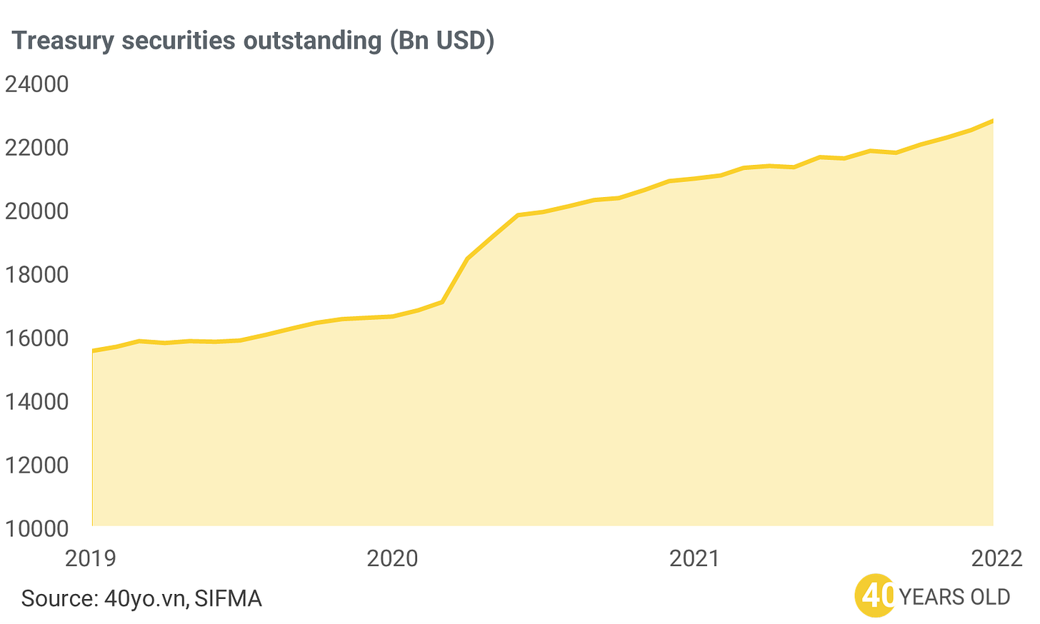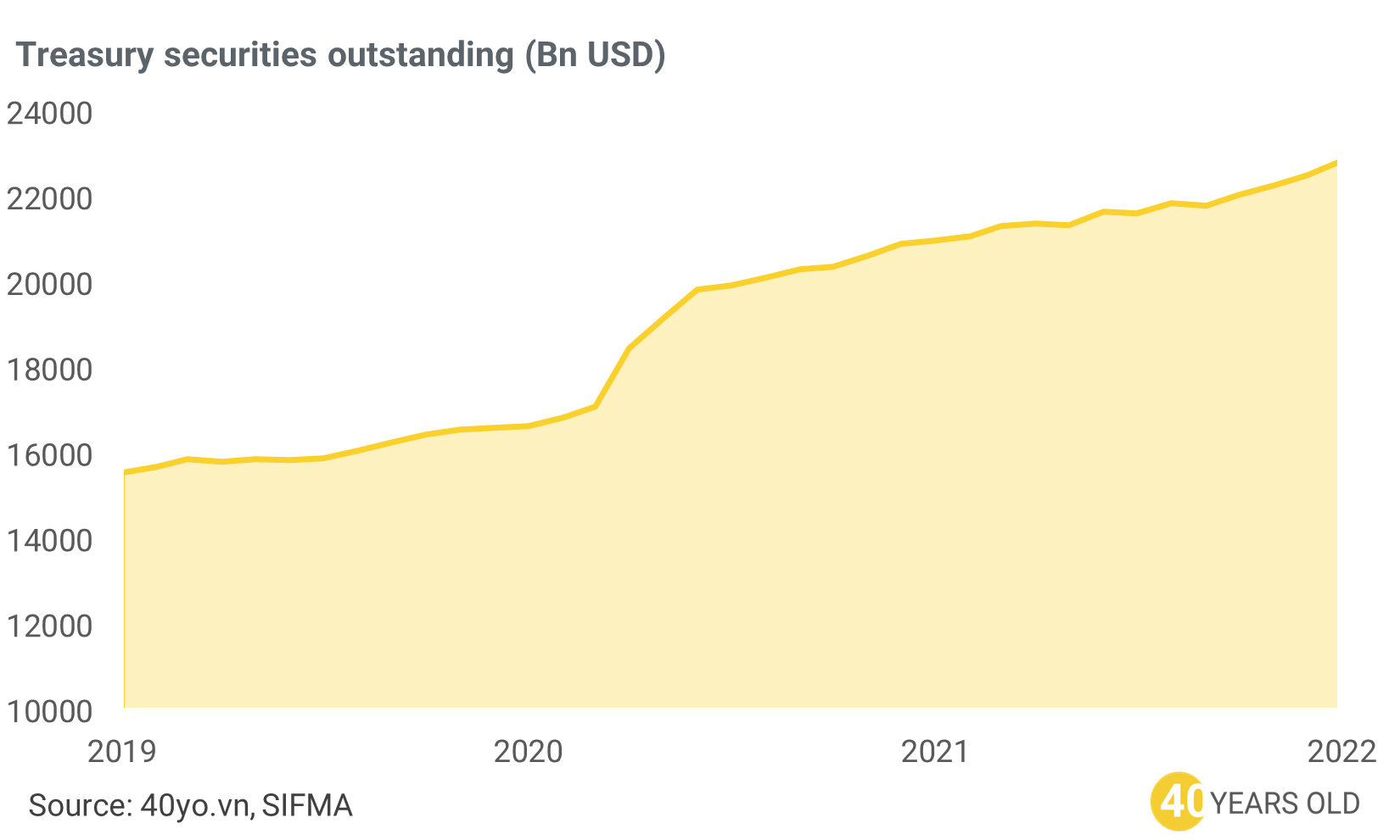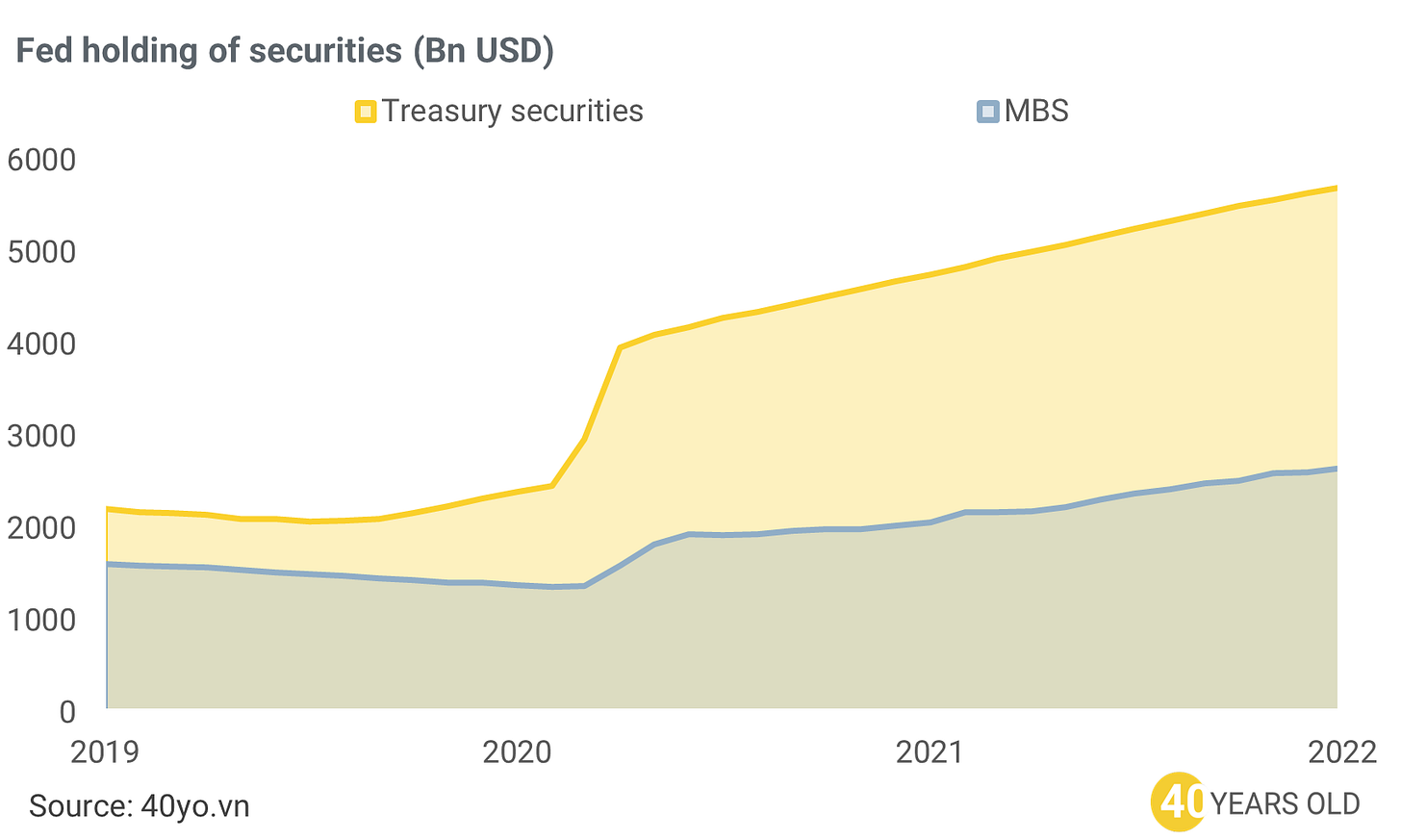 Để giải cứu, Fed một lần nữa đứng ra làm người mua chính. Fed tuyên bố mua TPCP với số lượng không giới hạn trên thị trường thứ cấp, vì luật không cho phép Fed mua trực tiếp từ Kho bạc. Dữ liệu cho thấy sự can thiệp này: Tổng tài sản của Fed nhảy từ 4.1 ngàn tỷ vào tháng 2/2020 lên 7.0 ngàn tỷ vào tháng 5/2020, chỉ trong 3 tháng. Đây chính là hành động gián tiếp giúp Bộ Tài chính có không gian thực hiện chính sách tài khóa.