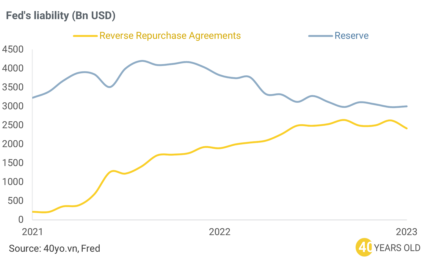 Dữ liệu cho thấy rõ điều này: Từ tháng 3/2021, khoản mục RRP tăng dựng đứng từ gần 0 lên đỉnh điểm hơn 2.6 ngàn tỷ USD. Đây chính là lượng Tiền gửi dư thừa được tạo ra từ QE 4, nay “quay về” nằm tại Fed.