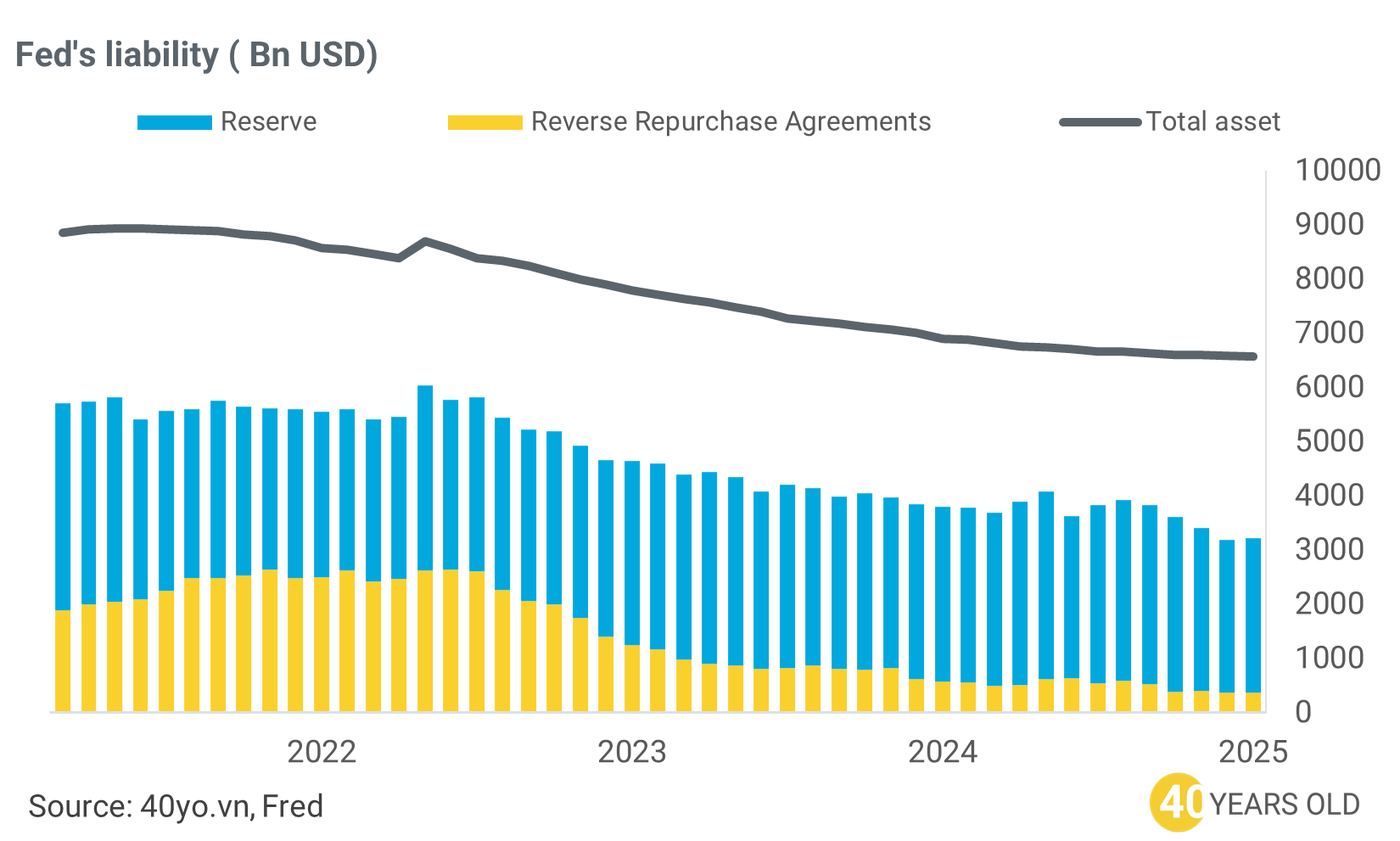 Như vậy, dù bằng cách nào, Thắt chặt định lượng cũng luôn luôn dẫn đến việc Tiền dự trữ hoặc RRP bị hút ròng khỏi hệ thống. Dữ liệu từ giữa năm 2022 đến nay cho thấy rõ quá trình này: Tổng tài sản của Fed giảm từ 8.9 ngàn tỷ xuống 6.8 ngàn tỷ USD. Và ở phía Nguồn vốn, cả Tiền dự trữ và RRP đều giảm mạnh để hấp thụ lượng tài sản giảm đi này. Đây chính là quá trình “hút tiền” về.