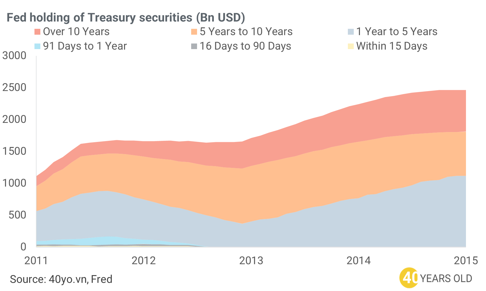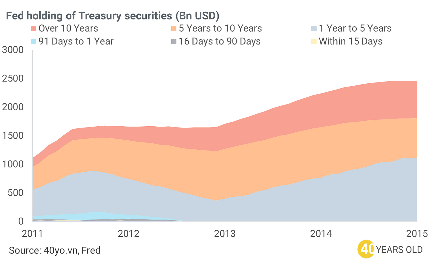 Cơ chế là Fed sẽ trở thành người mua lớn nhất trên thị trường TPCP. Bằng cách mua vào một lượng lớn TPCP, Fed làm tăng giá của chúng và đẩy lợi suất, vốn di chuyển ngược chiều với giá, xuống thấp. Dữ liệu cho thấy khoản mục TPCP mà Fed nắm giữ đã tăng đều đặn từ 777 tỷ USD vào tháng 10/2010 lên 2,462 tỷ USD vào tháng 10/2014.