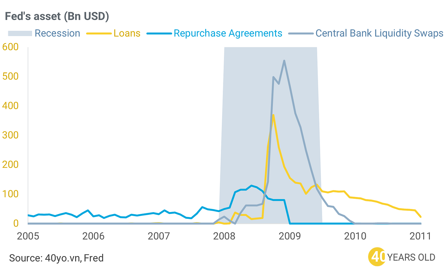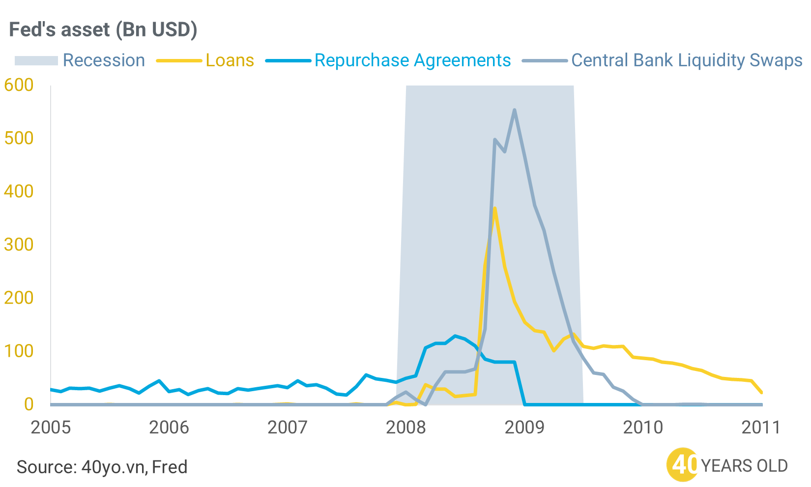 Trước khi chương trình QE chính thức bắt đầu, Fed đã cố gắng dập tắt cuộc khủng hoảng bằng các công cụ hỗ trợ thanh khoản truyền thống. Nhìn vào dữ liệu, chúng ta thấy các khoản mục như nghiệp vụ Repo, cho vay, và đặc biệt là hoán đổi thanh khoản với các NHTW khác đã tăng vọt trong giai đoạn cuối năm 2008. Khoản mục cho vay đã nhảy từ 17 tỷ USD vào tháng 8/2008 lên 370 tỷ USD vào tháng 10/2008.
