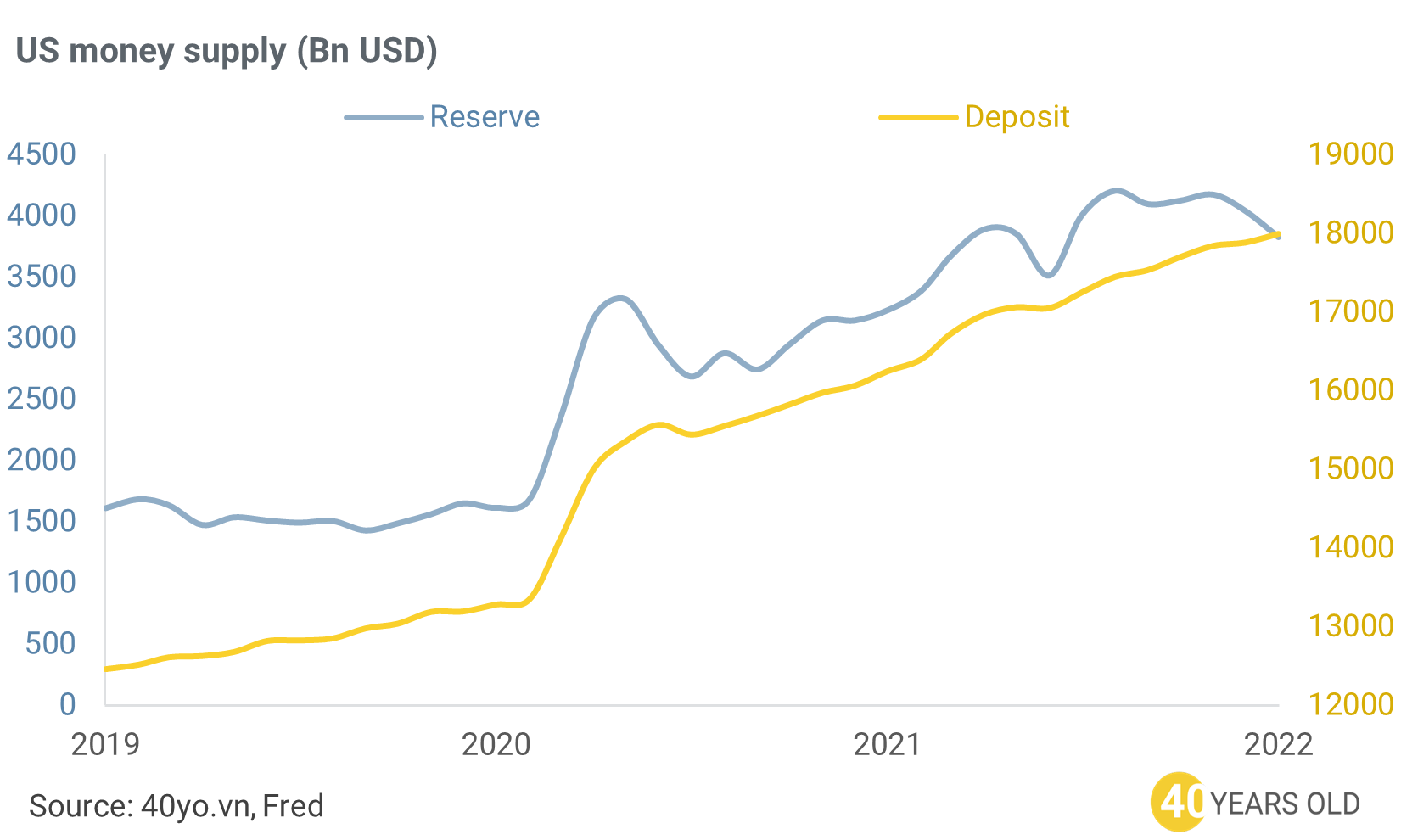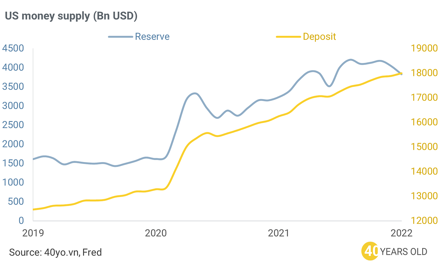 Đây chính là dấu vết cho thấy Fed đã mua tài sản từ ai. Dữ liệu chứng minh điều này: trong giai đoạn 3/2020 - 3/2022, không chỉ Tiền dự trữ tăng mạnh, mà Tiền gửi ngân hàng cũng tăng vọt từ 15 ngàn tỷ lên 18 ngàn tỷ USD. Tiền đã được “in” và đưa trực tiếp vào tài khoản của các tổ chức phi ngân hàng. Tiền dự trữ một lần nữa chỉ là hệ quả của giao dịch này.
