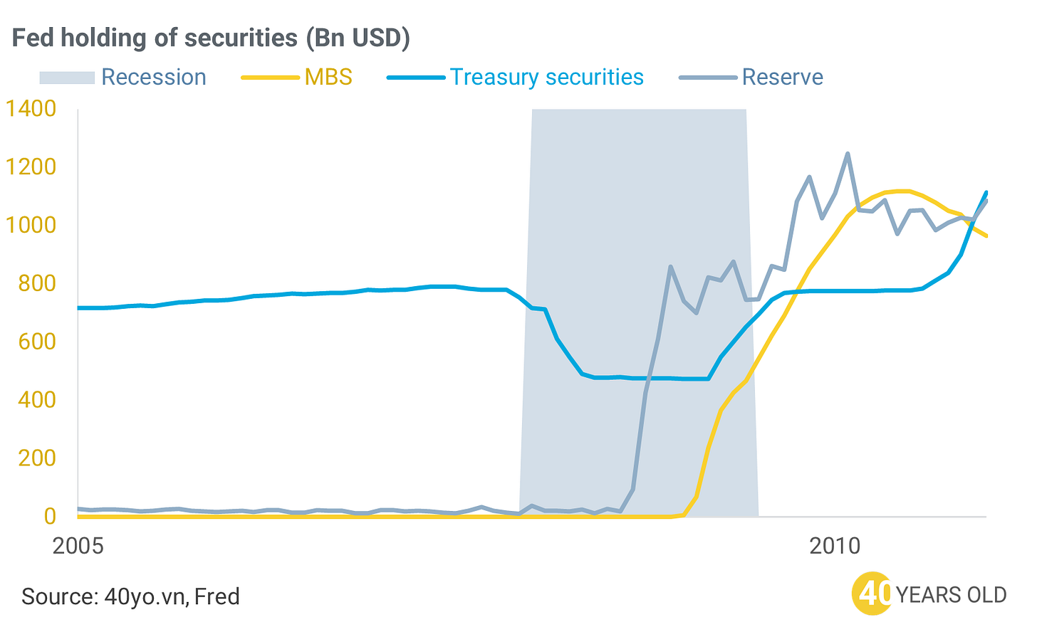 Do vậy, đến tháng 11/2008, Fed buộc phải hành động. Họ đứng ra làm người mua cuối cùng cho chính các tài sản này. Fed bắt đầu mua vào MBS, hút chúng ra khỏi BCĐKT của các ngân hàng. Dữ liệu cho thấy rõ điều này: khoản mục MBS trên BCĐKT của Fed tăng từ 0 lên tới đỉnh điểm 1,117 tỷ USD vào tháng 4/2010.